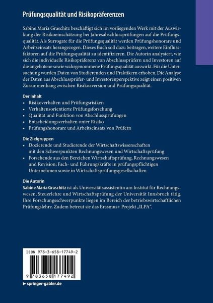 Sabine Maria Graschitz beschäftigt sich im vorliegenden Werk mit der Auswirkung der Risikoeinschätzung bei Jahresabschlussprüfungen auf die Prüfungsqualität. Als Surrogate für die Prüfungsqualität werden Prüfungshonorare und Arbeitseinsatz herangezogen. Dieses Buch soll dazu beitragen, weitere Einflussfaktoren auf die Prüfungsqualität zu identifizieren. Die Autorin analysiert, wie sich die individuelle Risikopräferenz von Abschlussprüfern und Investoren auf die angebotene sowie wahrgenommene Prüfungsqualität auswirkt. Für die Untersuchung wurden Daten von Studierenden und Praktikern erhoben. Die Analyse der Daten aus Abschlussprüfer- und Investorenperspektive zeigt einen positiven Zusammenhang zwischen Risikoaversion und Prüfungsqualität.