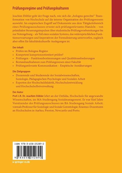 Joachim Döbler geht der Frage nach, wie sich die "bologna-gerechte" Transformation von Hochschule auf die interne Organisation des Prüfungswesens auswirkt. Im empirischen Zugriff auf Dokumente aus dem Tätigkeitsbereich eines Prüfungsausschusses erweist sich prüfungsrelevantes Handeln - von präsidialen Steuerungsimpulsen über studentische Prüfungsvorbereitungen bis zur Notengebung - als Teil eines sozialen Systems, das widersprüchlichen Funktionserwartungen und Imperativen der Formalisierung unterworfen, zugleich aber offen für fakultätskulturelle Auslegungen ist.