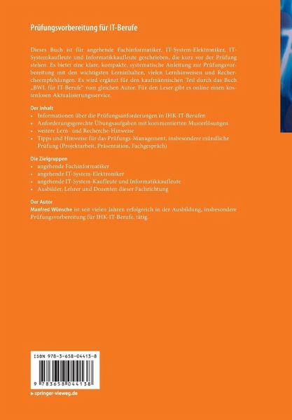 Dieses Buch ist für angehende Fachinformatiker, IT-System-Elektroniker, IT-Systemkaufleute und Informatikkaufleute geschrieben, die kurz vor der Prüfung stehen. Es bietet eine klare, kompakte, systematische Anleitung zur Prüfungsvorbereitung mit den wichtigsten Lerninhalten, vielen Lernhinweisen und Rechercheempfehlungen. Es wird ergänzt für den kaufmännischen Teil durch das Buch "BWL für IT-Berufe" vom gleichen Autor. Für den Leser gibt es online einen kostenlosen Aktualisierungsservice.