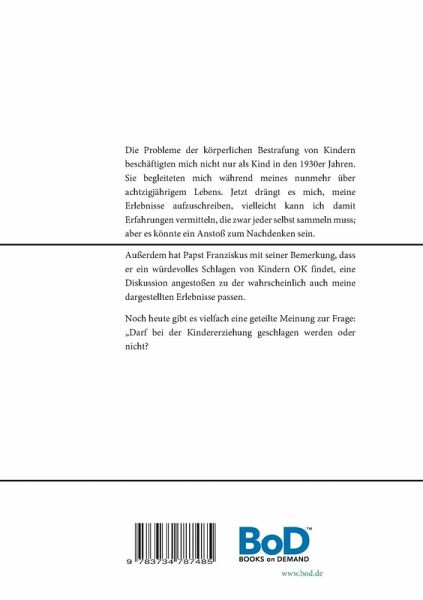 Die Probleme der körperlichen Bestrafung von Kindern beschäftigten mich nicht nur als Kind in den 1930er Jahren. Sie begleiteten mich während meines nunmehr über achtzigjährigem Lebens. Jetzt drängt es mich, meine Erlebnisse aufzuschreiben, vielleicht kann ich damit Erfahrungen vermitteln, die zwar jeder selbst sammeln muss; aber es könnte ein Anstoß zum Nachdenken sein. Außerdem hat Papst Franziskus mit seiner Bemerkung, dass er ein würdevolles Schlagen von Kindern OK findet, eine Diskussion angestoßen zu der wahrscheinlich auch meine dargestellten Erlebnisse passen.Noch heute gibt es vielfach eine geteilte Meinung zur Frage: "Darf bei der Kindererziehung geschlagen werden oder nicht?