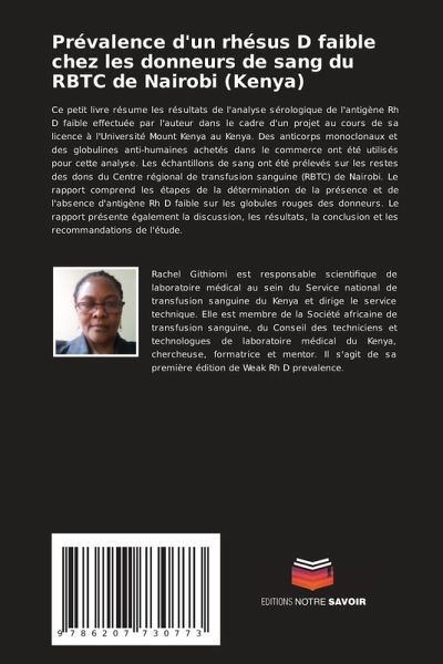 Ce petit livre résume les résultats de l'analyse sérologique de l'antigène Rh D faible effectuée par l'auteur dans le cadre d'un projet au cours de sa licence à l'Université Mount Kenya au Kenya. Des anticorps monoclonaux et des globulines anti-humaines achetés dans le commerce ont été utilisés pour cette analyse. Les échantillons de sang ont été prélevés sur les restes des dons du Centre régional de transfusion sanguine (RBTC) de Nairobi. Le rapport comprend les étapes de la détermination de la présence et de l'absence d'antigène Rh D faible sur les globules rouges des donneurs. Le rapport présente également la discussion, les résultats, la conclusion et les recommandations de l'étude.