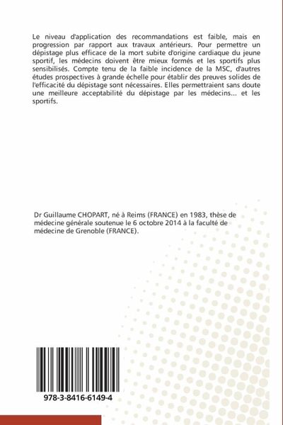 Le niveau d'application des recommandations est faible, mais en progression par rapport aux travaux antérieurs. Pour permettre un dépistage plus efficace de la mort subite d'origine cardiaque du jeune sportif, les médecins doivent être mieux formés et les sportifs plus sensibilisés. Compte tenu de la faible incidence de la MSC, d'autres études prospectives à grande échelle pour établir des preuves solides de l'efficacité du dépistage sont nécessaires. Elles permettraient sans doute une meilleure acceptabilité du dépistage par les médecins... et les sportifs.