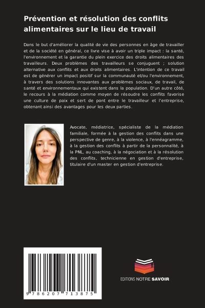 Dans le but d'améliorer la qualité de vie des personnes en âge de travailler et de la société en général, ce livre vise à avoir un triple impact : la santé, l'environnement et la garantie du plein exercice des droits alimentaires des travailleurs. Deux problèmes des travailleurs se conjuguent ; solution alternative aux conflits et aux droits alimentaires. L'intention de ce travail est de générer un impact positif sur la communauté et/ou l'environnement, à travers des solutions innovantes aux problèmes sociaux, de travail, de santé et environnementaux qui existent dans la population. D'un autre côté, le recours à la médiation comme moyen de résoudre les conflits favorise une culture de paix et sert de pont entre le travailleur et l'entreprise, obtenant ainsi des avantages pour les deux parties.