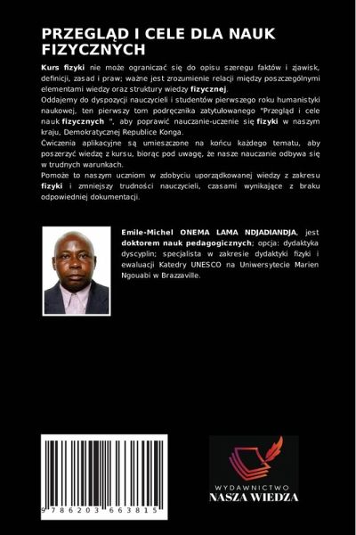 Kurs fizyki nie mo¿e ograniczä si¿ do opisu szeregu faktów i zjawisk, definicji, zasad i praw; wäne jest zrozumienie relacji mi¿dzy poszczególnymi elementami wiedzy oraz struktury wiedzy fizycznej.Oddajemy do dyspozycji nauczycieli i studentów pierwszego roku humanistyki naukowej, ten pierwszy tom podr¿cznika zatytu¿owanego "Przegl¿d i cele nauk fizycznych ", aby poprawi¿ nauczanie-uczenie si¿ fizyki w naszym kraju, Demokratycznej Republice Konga.¿wiczenia aplikacyjne s¿ umieszczone na ko¿cu kädego tematu, aby poszerzy¿ wiedz¿ z kursu, bior¿c pod uwag¿, ¿e nasze nauczanie odbywa si¿ w trudnych warunkach. Pomo¿e to naszym uczniom w zdobyciu uporz¿dkowanej wiedzy z zakresu fizyki i zmniejszy trudno¿ci nauczycieli, czasami wynikaj¿ce z braku odpowiedniej dokumentacji.