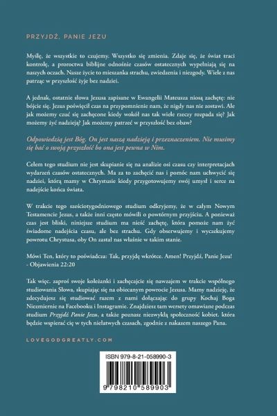 My¿l¿, ze wszystkie to czujemy. Wszystko si¿ zmienia. Zdaje si¿, ¿e ¿wiat traci kontrol¿, a proroctwa biblijne odnönie czasów ostatecznych wype¿niaj¿ si¿ na naszych oczach. Nasze ¿ycie to mieszanka strachu, zwiedzenia i niezgody. Wiele z nas patrz¿c w przysz¿ö¿ ¿yje bez nadziei. A jednak, ostatnie s¿owa Jezusa zapisane w Ewangelii Mateusza nios¿ zach¿t¿: nie bójcie si¿. Jezus pöwieci¿ czas na przypomnienie nam, ¿e nigdy nas nie zostawi. Ale jak möemy czü si¿ zach¿cone kiedy wokó¿ nas tak wiele rzeczy rozpada si¿? Jak möemy ¿y¿ nadziej¿? Jak möemy patrze¿ w przysz¿ö¿ bez obaw? Odpowiedzi¿ jest Bóg. On jest nasza nadzieja i przeznaczeniem. Nie musimy si¿ bä o swoj¿ przysz¿ö¿ bo ona jest pewna w Nim. Celem tego studium nie jest skupianie si¿ na analizie osi czasu czy interpretacjach wydarze¿ czasów ostatecznych. Ma za to zach¿ci¿ nas i pomóc nam uchwyci¿ si¿ nadziei, któr¿ mamy w Chrystusie kiedy przygotowujemy swój umys¿ i serce na nadej¿cie köca ¿wiata. W trakcie tego sze¿ciotygodniowego studium odkryjemy, ¿e w cäym Nowym Testamencie Jezus, a tak¿e inni cz¿sto mówili o powtórnym przyj¿ciu. A poniewä czas jest bliski, niniejsze studium ma nie¿¿ zach¿t¿, która pomöe nam ¿y¿ ¿wiadomymi nadej¿cia czasu, ale bez strachu. Gdy obserwujemy i wyczekujemy powrotu Chrystusa, oby On zastä nas w¿änie w takim stanie. Mówi Ten, który to pöwiadcza: Tak, przyjd¿ wkrótce. Amen! Przyjd¿, Panie Jezu! - Objawienia 22:20 Tak wi¿c. zaprö swoje kole¿anki i zach¿cajcie si¿ nawzajem w trakcie wspólnego studiowania S¿owa, skupiaj¿c si¿ na obiecanym powrocie Jezusa. Mamy nadziej¿, ¿e zdecydujesz si¿ studiowä razem z nami dö¿czaj¿c do grupy Kochaj Boga Niezmiernie na Facebooku i Instagramie. Znajdziesz tam wersety omawiane podczas studium Przyjd¿ Panie Jezu, a tak¿e poznasz niezwyk¿¿ spöecznö¿ kobiet. która b¿dzie wspierä ci¿ w tych nie¿atwych czasach, zgodnie z nakazem naszego Pana.