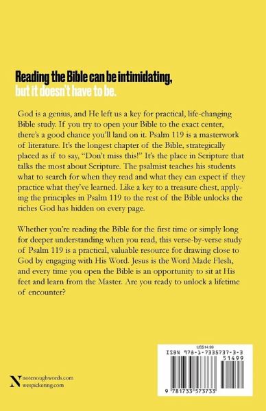 Reading the Bible can be intimidating, but it doesn't have to be. God is a genius, and He left us a key for practical, life-changing Bible study. If you try to open your Bible to the exact center, there's a good chance you'll land on it. Psalm 119 is a masterwork of literature. It's the longest chapter of the Bible, strategically placed as if to say, "Don't miss this!" It's the place in Scripture that talks the most about Scripture. The psalmist teaches his students what to search for when they read and what they can expect if they practice what they've learned. Like a key to a treasure chest, applying the principles in Psalm 119 to the rest of the Bible unlocks the riches God has hidden on every page. Whether you're reading the Bible for the first time or simply long for deeper understanding when you read, this verse-by-verse study of Psalm 119 is a practical, valuable resource for drawing close to God by engaging with His Word. Jesus is the Word made flesh, and every time you open the Bible is an opportunity to sit at His feet and learn from the Master. Are you ready to unlock a lifetime of encounter?