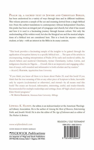 Psalm 29, a sacred text in Jewish and Christian Bibles, has been understood in a variety of ways through time and in different traditions. This volume presents a sample of the use and meaning derived from a single biblical text. From the earliest translations to contemporary African Independent Churches, this psalm has been an integral part of synagogue and church; but what it has meant and how it is used is a fascinating journey through human culture. Not only the understanding of the written word, but also the liturgical use and the musical adaptations of a biblical text are considered here. This is a book for anyone--scholar, student, or laity--with an interest in the Bible in its many contexts.