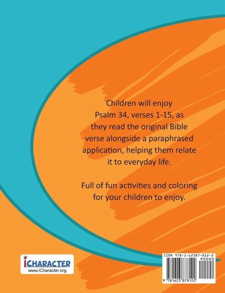 Children will enjoy Psalm 34, verses 1-15, as they read the original Bible verse alongside a paraphrased application, helping them relate it to everyday life. Full of fun activities and coloring for your children to enjoy. This book can be used in conjunction with the book "Psalm 34" or even on its own. You will find plenty of fun for kids including coloring pages, dot-to-dots, mazes, letter quizzes, doodle pages, life applications, word searches and more, to help children delve into this Bible chapter in an enjoyable way. Each original Bible verse along with an adapted version helps children to understand and apply it to their own life. For more kids products and free downloads, visit our website at www.icharacter.org