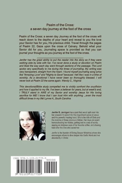 Psalm of the Cross: a seven day journey at the foot of the cross will reach down to the depths of your heart and reveal to you the love your Savior has for you, His precious child. Travel through the pages of Psalm 22. Gaze upon the cross of Calvary. Behold what your Savior did for you. Journaling space is provided so that you can journal your thoughts as your journey at the foot of the cross.