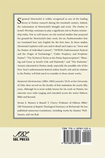 Sigmund Mowinckel is widely recognized as one of the leading forces in Psalms research during the twentieth century. His six Psalmenstudien are translated here in two volumes into English for the first time. Anyone interested in Psalms study, especially the possible role of the New Years enthronement festival within Israels cult and its relation to the Psalter, will find much to consider in these classic works.