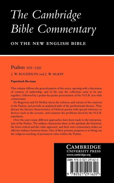 This volume follows the general pattern of the series, opening with a discussion of content, of authorship, and of the way the collection came to be put together, followed by a psalm-by-psalm presentation of the N.E.B. text with commentary. Dr Rogerson and Dr McKay stress the richness and variety of the material in the Psalms, and provide an analytical table of the predominant themes. They discuss the literary characteristics of Hebrew poetry with special reference to devices such as the acrostic, and examine the problems faced by the N.E.B. translators. Over the years many different approaches have been made to the interpretation of the Psalms. The authors characterize these as the spiritual, the historical, the form-critical and the cultic approach, and their own commentary strikes an effective balance between them. One of their primary purposes is to bring out the religious teaching of permanent value within the Psalms.