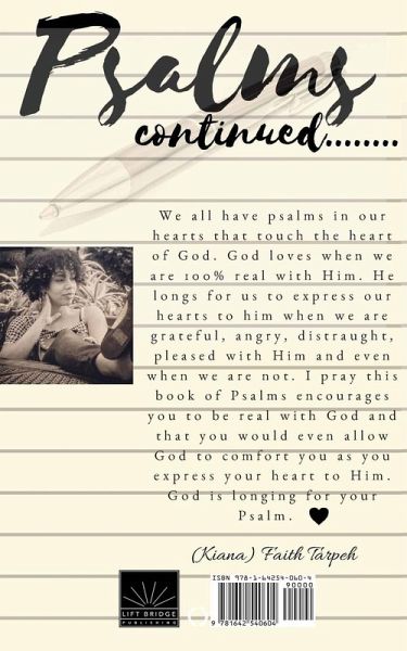 We all have psalms in our hearts that touch the heart of God. God loves when we are 100% real with Him. He longs for us to express our hearts to him when we are grateful, angry, distraught, pleased with Him and even when we are not. I pray this book of Psalms encourages you to be real with God and that you would even allow God to comfort you as you express your heart to Him. God is longing for your Psalm.