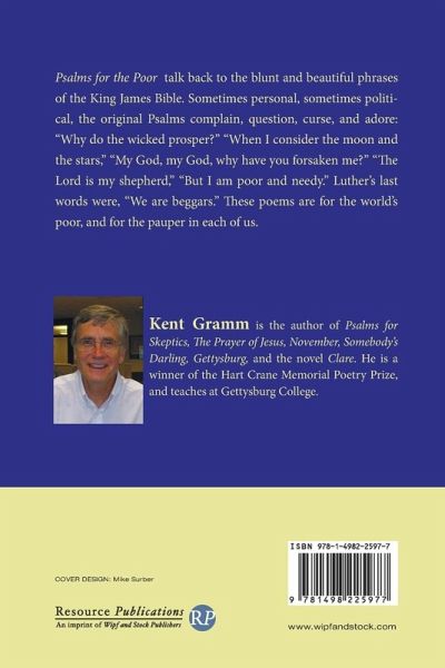 Psalms for the Poor talk back to the blunt and beautiful phrases of the King James Bible. Sometimes personal, sometimes political, the original Psalms complain, question, curse, and adore: ""Why do the wicked prosper?"" ""When I consider the moon and the stars,"" ""My God, my God, why have you forsaken me?"" ""The Lord is my shepherd,"" ""But I am poor and needy."" Luther's last words were, ""We are beggars."" These poems are for the world's poor, and for the pauper in each of us. Kent Gramm is the author of Psalms for Skeptics, The Prayer of Jesus, November, Somebody's Darling, Gettysburg, and the novel Clare. He is a winner of the Hart Crane Memorial Poetry Prize, and teaches at Gettysburg College.