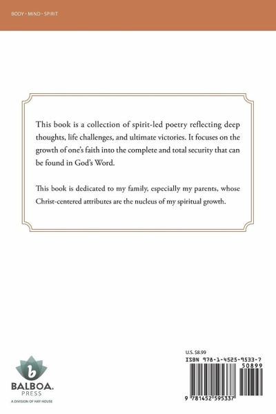 This book is a collection of spirit-led poetry reflecting deep thoughts, life challenges, and ultimate victories. It focuses on the growth of one's faith into the complete and total security that can be found in God's Word. This book is dedicated to my family, especially my parents, whose Christ-centered attributes are the nucleus of my spiritual growth.
