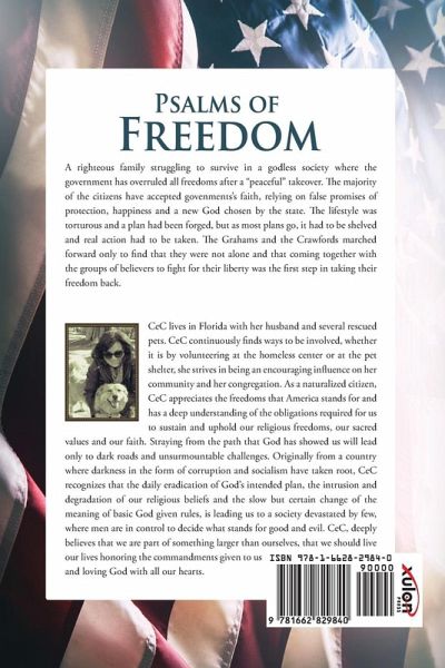 A righteous family struggling to survive in a godless society where the government has overruled all freedoms after a "peaceful" takeover. The majority of the citizens have accepted govenments's faith, relying on false promises of protection, happiness and a new God chosen by the state. The lifestyle was torturous and a plan had been forged, but as most plans go, it had to be shelved and real action had to be taken. The Grahams and the Crawfords marched forward only to find that they were not alone and that coming together with the groups of believers to fight for their liberty was the first step in taking their freedom back. CeC lives in Florida with her husband and several rescued pets. CeC continuously finds ways to be involved, whether it is by volunteering at the homeless center or at the pet shelter, she strives in being an encouraging influence on her community and her congregation. As a naturalized citizen, CeC appreciates the freedoms that America stands for and has a deep understanding of the obligations required for us to sustain and uphold our religious freedoms, our sacred values and our faith. Straying from the path that God has showed us will lead only to dark roads and unsurmountable challenges. Originally from a country where darkness in the form of corruption and socialism have taken root, CeC recognizes that the daily eradication of God's intended plan, the intrusion and degradation of our religious beliefs and the slow but certain change of the meaning of basic God given rules, is leading us to a society devastated by few, where men are in control to decide what stands for good and evil. CeC, deeply believes that we are part of something larger than ourselves, that we should live our lives honoring the commandments given to us and loving God with all our hearts.