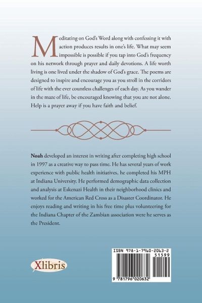 Meditating on God's Word along with confessing it with action produces results in one's life. What may seem impossible is possible if you tap into God's frequency on his network through prayer and daily devotions. A life worth living is one lived under the shadow of God's grace. The poems are designed to inspire and encourage you as you stroll in the corridors of life with the ever countless challenges of each day. As you wander in the maze of life, be encouraged knowing that you are not alone. Help is a prayer away if you have faith and belief.