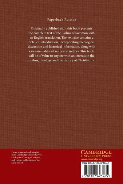 Originally published 1891, this book presents the complete text of the Psalms of Solomon with an English translation. The text also contains a detailed introduction, incorporating theological discussion and historical information, along with extensive editorial notes and indices. This book will be of value to anyone with an interest in the psalms, theology and the history of Christianity.