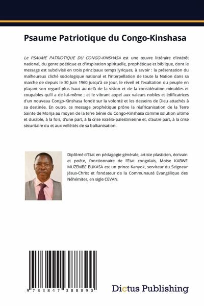 Le PSAUME PATRIOTIQUE DU CONGO-KINSHASA est une oeuvre littéraire d'intérêt national, du genre poétique et d'inspiration spirituelle, prophétique et biblique, dont le message est subdivisé en trois principaux temps lyriques, à savoir : la présentation du malheureux cliché sociologique national et l'interpellation de toute la Nation dans sa marche de depuis le 30 Juin 1960 jusqu'à ce jour, le réveil et l'exaltation du peuple en plaçant son regard plus haut au-delà de la vision et de la considération minables et coupables qu'il a de lui-même ; et le vibrant appel aux valeurs nobles et édificatrices d'un nouveau Congo-Kinshasa fondé sur la volonté et les desseins de Dieu attachés à sa destinée. En outre, ce message prophétique prône la réafricanisation de la Terre Sainte de Morija au moyen de la terre bénie du Congo-Kinshasa comme solution ultime et durable, à la fois, d'une part, à la crise israélo-palestinienne et, d'autre part, à la crise sécuritaire du et aux velléités de sa balkanisation.