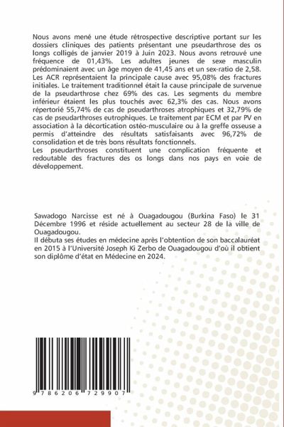 Nous avons mené une étude rétrospective descriptive portant sur les dossiers cliniques des patients présentant une pseudarthrose des os longs colligés de janvier 2019 à Juin 2023. Nous avons retrouvé une fréquence de 01,43%. Les adultes jeunes de sexe masculin prédominaient avec un âge moyen de 41,45 ans et un sex-ratio de 2,58. Les ACR représentaient la principale cause avec 95,08% des fractures initiales. Le traitement traditionnel était la cause principale de survenue de la pseudarthrose chez 69% des cas. Les segments du membre inférieur étaient les plus touchés avec 62,3% des cas. Nous avons répertorié 55,74% de cas de pseudarthroses atrophiques et 32,79% de cas de pseudarthroses eutrophiques. Le traitement par ECM et par PV en association à la décortication ostéo-musculaire ou à la greffe osseuse a permis d'atteindre des résultats satisfaisants avec 96,72% de consolidation et de très bons résultats fonctionnels.Les pseudarthroses constituent une complication fréquente et redoutable des fractures des os longs dans nos pays en voie de développement.