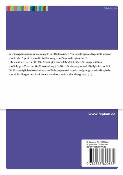 In der Diplomarbeit "Pseudoallergien - dargestellt anhand von Studien" geht es um die Aufdeckung von Pseudoallergien durch Lebensmittelzusatzstoffe. Die Arbeit gibt einen Überblick über die ausgewählten verdächtigen Zusatzstoffe, Verwendung, ADI-Wert, Dosierungen und Häufigkeit von PAR.
