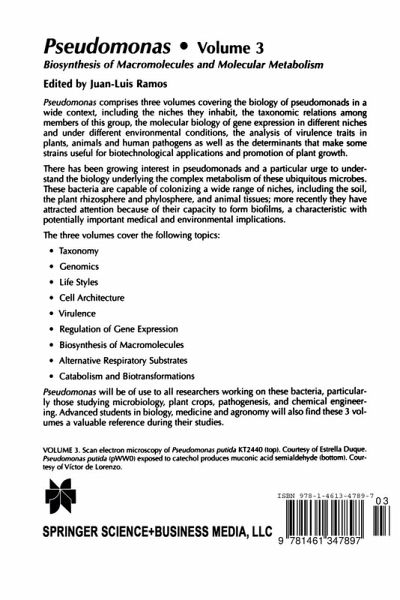 Pseudomonas comprises three volumes covering the biology of pseudomonads in a wide context, including the niches they inhabit, the taxonomic relations among members of this group, the molecular biology of gene expression in different niches and under different environmental conditions, the analysis of virulence traits in plants, animals and human pathogens as well as the determinants that make some strains useful for biotechnological applications and promotion of plant growth.