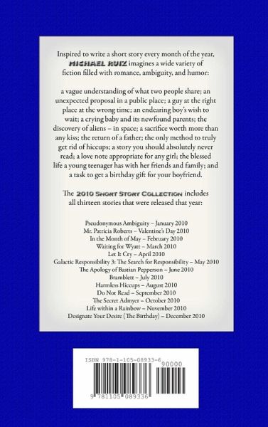 Inspired to write a short story every month of the year, Michael Ruiz imagines a wide variety of fiction filled with romance, ambiguity, and humor: a vague understanding of what two people share; an unexpected proposal in a public place; a guy at the right place at the wrong time; an endearing boy's wish to wait; a crying baby and its newfound parents; the discovery of aliens - in space; a sacrifice worth more than any kiss; the return of a father; the only method to truly get rid of hiccups; a story you should absolutely never read; a love note appropriate for any girl; the blessed life a young teenager has with her friends and family; and a task to get a birthday gift for your boyfriend. The 2010 Short Story Collection includes all thirteen stories that were released that year.