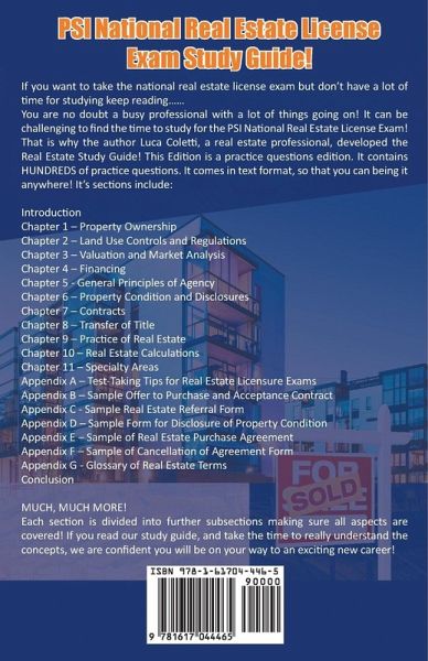 If you want to take the national real estate license exam but don't have a lot of time for studying keep reading...... You are no doubt a busy professional with a lot of things going on! It can be challenging to find the time to study for the PSI National Real Estate License Exam! That is why the author Luca Coletti, a real estate professional, developed the Real Estate Study Guide! This Edition is a practice questions edition. It contains HUNDREDS of practice questions. It comes in text format, so that you can being it anywhere! It's sections include: Introduction Chapter 1 - Property Ownership Chapter 2 - Land Use Controls and Regulations Chapter 3 - Valuation and Market Analysis Chapter 4 - Financing Chapter 5 - General Principles of Agency Chapter 6 - Property Condition and Disclosures Chapter 7 - Contracts Chapter 8 - Transfer of Title Chapter 9 - Practice of Real Estate Chapter 10 - Real Estate Calculations Chapter 11 - Specialty Areas Appendix A - Test-Taking Tips for Real Estate Licensure Exams Appendix B - Sample Offer to Purchase and Acceptance Contract Appendix C - Sample Real Estate Referral Form Appendix D - Sample Form for Disclosure of Property Condition Appendix E - Sample of Real Estate Purchase Agreement Appendix F - Sample of Cancellation of Agreement Form Appendix G - Glossary of Real Estate Terms Conclusion MUCH, MUCH MORE! Each section is divided into further subsections making sure all aspects are covered! If you read our study guide, and take the time to really understand the concepts, we are confident you will be on your way to an exciting new career!
