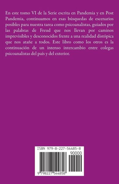 En este tomo VI de la Serie escrita en Pandemia y en Post Pandemia, continuamos en esas búsquedas de escenarios posibles para nuestra tarea como psicoanalistas, guiados por las palabras de Freud que nos llevan por caminos imprevisibles y desconocidos frente a una realidad distópica que nos atañe a todos. Este libro como los otros es la continuación de un intenso intercambio entre colegas psicoanalistas del país y del exterior.