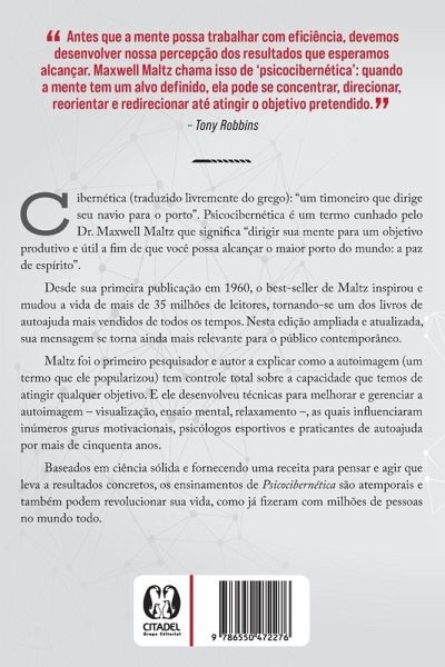 Cibernética (traduzido livremente do grego): "um timoneiro que dirige seu navio para o porto". Psicocibernética é um termo cunhado pelo Dr. Maxwell Maltz que significa "dirigir sua mente para um objetivo produtivo e útil a fim de que você possa alcançar o maior porto do mundo: a paz de espírito". Desde sua primeira publicação em 1960, o best-seller de Maltz inspirou e mudou a vida de mais de 35 milhões de leitores, tornando-se um dos livros de autoajuda mais vendidos de todos os tempos. Nesta edição ampliada e atualizada, sua mensagem se torna ainda mais relevante para o público contemporâneo. Maltz foi o primeiro pesquisador e autor a explicar como a autoimagem (um termo que ele popularizou) tem controle total sobre a capacidade que temos de atingir qualquer objetivo. E ele desenvolveu técnicas para melhor e gerenciar a autoimagem ¿ visualização, ensaio mental, relaxamento ¿, as quais influenciaram inúmeros gurus motivacionais, psicólogos esportivos e praticantes de autoajuda por mais de cinquenta anos. Baseados em ciência sólida e fornecendo uma receita para pensar e agir que leva a resultados concretos, os ensinamentos de Psicocibernética são atemporais e também podem revolucionar sua vida, como fez com milhões de pessoas no mundo todo.