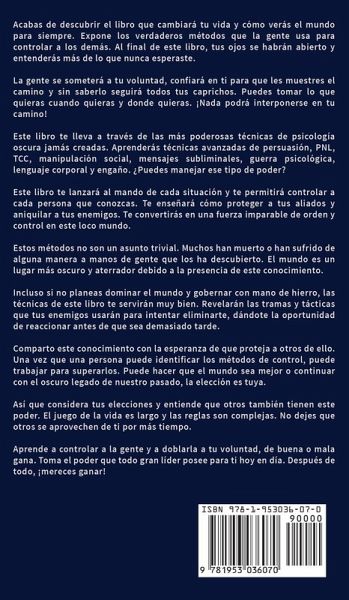 Acabas de descubrir el libro que cambiará tu vida y cómo verás el mundo para siempre. Expone los verdaderos métodos que la gente usa para controlar a los demás. Al final de este libro, tus ojos se habrán abierto y entenderás más de lo que nunca esperaste. La gente se someterá a tu voluntad, confiará en ti para que les muestres el camino y sin saberlo seguirá todos tus caprichos. Puedes tomar lo que quieras cuando quieras y donde quieras. ¡Nada podrá interponerse en tu camino!Este libro te lleva a través de las más poderosas técnicas de psicología oscura jamás creadas. Aprenderás técnicas avanzadas de persuasión, PNL, TCC, manipulación social, mensajes subliminales, guerra psicológica, lenguaje corporal y engaño. ¿Puedes manejar ese tipo de poder?Este libro te lanzará al mando de cada situación y te permitirá controlar a cada persona que conozcas. Te enseñará cómo proteger a tus aliados y aniquilar a tus enemigos. Te convertirás en una fuerza imparable de orden y control en este loco mundo.Estos métodos no son un asunto trivial. Muchos han muerto o han sufrido de alguna manera a manos de gente que los ha descubierto. El mundo es un lugar más oscuro y aterrador debido a la presencia de este conocimiento.Incluso si no planeas dominar el mundo y gobernar con mano de hierro, las técnicas de este libro te servirán muy bien. Revelarán las tramas y tácticas que tus enemigos usarán para intentar eliminarte, dándote la oportunidad de reaccionar antes de que sea demasiado tarde.Comparto este conocimiento con la esperanza de que proteja a otros de ello. Una vez que una persona puede identificar los métodos de control, puede trabajar para superarlos. Puede hacer que el mundo sea mejor o continuar con el oscuro legado de nuestro pasado, la elección es tuya. Así que considera tus elecciones y entiende que otros también tienen este poder. El juego de la vida es largo y las reglas son complejas. No dejes que otros se aprovechen de ti por más tiempo.Aprende a controlar a la gente y a doblarla a tu voluntad, de buena o mala gana. Toma el poder que todo gran líder posee para ti hoy en día. Después de todo, ¡mereces ganar!