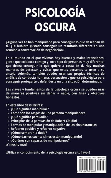 ¿Alguna vez te han manipulado para conseguir lo que deseaban de ti? ¿Te hubiera gustado conseguir un resultado diferente en una reunión o conversación de negociación? Por primera vez, las técnicas secretas más efectivas y poderosas de psicología oscura reunidas en un libro. En el mundo en el que vivimos hay buenas y malas intenciones, gente que coopera contigo y otra muy diferente que desea conseguir lo que quiere a costa de los demás. Hay muchas maneras de detectar y evitar que estas personas nos usen a su antojo. Además, también podemos usar sus propias técnicas de análisis de conducta humana, persuasión o engaño para conseguir defendernos en una situación determinada. Las claves y fundamentos del control mental y la manipulación se pueden usar de maneras positivas sin dañar a nadie, con fines y objetivos honestos. En este libro descubrirás:Qué significa manipular Cómo son los rasgos de una persona manipuladora Qué significa persuadir Principios de la persuasión de Robert Cialdini Formas de manipular y manipulación de las circunstancias Refuerzo positivo y refuerzo negativo Cómo sembrar la duda Cómo darnos cuenta si nos están manipulando Quiénes son capaces de manipularnos ¡Y mucho más! ¡Utiliza las ventajas de la psicología oscura a tu favor!