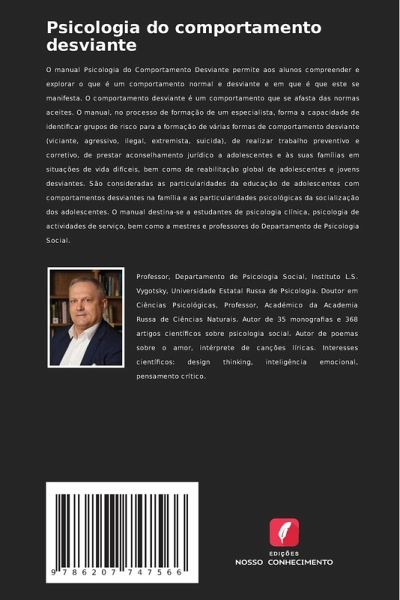 O manual Psicologia do Comportamento Desviante permite aos alunos compreender e explorar o que é um comportamento normal e desviante e em que é que este se manifesta. O comportamento desviante é um comportamento que se afasta das normas aceites. O manual, no processo de formação de um especialista, forma a capacidade de identificar grupos de risco para a formação de várias formas de comportamento desviante (viciante, agressivo, ilegal, extremista, suicida), de realizar trabalho preventivo e corretivo, de prestar aconselhamento jurídico a adolescentes e às suas famílias em situações de vida difíceis, bem como de reabilitação global de adolescentes e jovens desviantes. São consideradas as particularidades da educação de adolescentes com comportamentos desviantes na família e as particularidades psicológicas da socialização dos adolescentes. O manual destina-se a estudantes de psicologia clínica, psicologia de actividades de serviço, bem como a mestres e professores do Departamento de Psicologia Social.