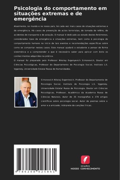 Atualmente, no mundo e no nosso país, há cada vez mais casos de situações extremas e de emergência. Há casos de prevenção de actos terroristas, de tomada de reféns, de acidentes de transporte e de aviação. O manual é dedicado ao estudo destes fenómenos, considerados tipos de emergência e situações extremas, bem como à psicologia do comportamento humano no início de tais eventos e recomendações específicas sobre como se comportar nestes casos. Este manual ajudará o estudante a pensar de forma sistemática e a compreender o que é necessário saber para aplicar com êxito os conhecimentos adquiridos na prática.O manual foi preparado pelo Professor Nikolay Evgenyevich Simonovich, Doutor em Ciências Psicológicas, Professor do Departamento de Psicologia Social, Instituto L.S. Vygotsky, Universidade Estatal Russa de Humanidades.