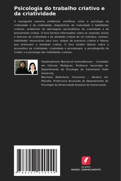 A monografia examina problemas científicos como a psicologia da criatividade e da criatividade, diagnósticos de criatividade e habilidades criativas, problemas de abordagens psicanalíticas da criatividade e do pensamento criativo. O livro fornece informações sobre os aspectos únicos e diversos da criatividade e da atividade criativa de um indivíduo, motivos, habilidades necessárias para isso, etapas do processo criativo e fatores que estimulam a atividade criativa. O livro contém tópicos sobre a psicanálise da criatividade, criatividade e psicoterapia, a psicobiografia do criador e a psicologia das habilidades criativas.