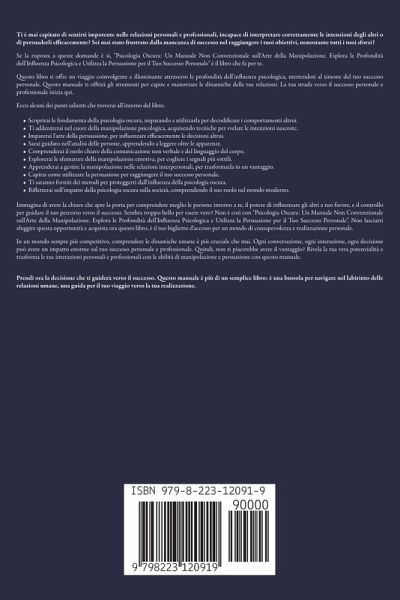 Ti è mai capitato di sentirti impotente nelle relazioni personali e professionali, incapace di interpretare correttamente le intenzioni degli altri o di persuaderli efficacemente? Sei mai stato frustrato dalla mancanza di successo nel raggiungere i tuoi obiettivi, nonostante tutti i tuoi sforzi? Se la risposta a queste domande è sì, "Psicologia Oscura: Un Manuale Non Convenzionale sull'Arte della Manipolazione. Esplora le Profondità dell'Influenza Psicologica e Utilizza la Persuasione per il Tuo Successo Personale" è il libro che fa per te. Questo libro ti offre un viaggio coinvolgente e illuminante attraverso le profondità dell'influenza psicologica, mettendoti al timone del tuo successo personale. Questo manuale ti offrirà gli strumenti per capire e manovrare le dinamiche delle tue relazioni. La tua strada verso il successo personale e professionale inizia qui. Ecco alcuni dei punti salienti che troverai all'interno del libro.Scoprirai le fondamenta della psicologia oscura, imparando a utilizzarla per decodificare i comportamenti altrui. Ti addentrerai nel cuore della manipolazione psicologica, acquisendo tecniche per svelare le intenzioni nascoste. Imparerai l'arte della persuasione, per influenzare efficacemente le decisioni altrui. Sarai guidato nell'analisi delle persone, apprendendo a leggere oltre le apparenze. Comprenderai il ruolo chiave della comunicazione non verbale e del linguaggio del corpo. Esplorerai le sfumature della manipolazione emotiva, per cogliere i segnali più sottili. Apprenderai a gestire la manipolazione nelle relazioni interpersonali, per trasformarla in un vantaggio. Capirai come utilizzare la persuasione per raggiungere il tuo successo personale. Ti saranno forniti dei metodi per proteggerti dall'influenza della psicologia oscura. Rifletterai sull'impatto della psicologia oscura sulla società, comprendendo il suo ruolo nel mondo moderno. Immagina di avere la chiave che apre la porta per comprendere meglio le persone intorno a te, il potere di influenzare gli altri a tuo favore, e il controllo per guidare il tuo percorso verso il successo. Sembra troppo bello per essere vero? Non è così con "Psicologia Oscura: Un Manuale Non Convenzionale sull'Arte della Manipolazione. Esplora le Profondità dell'Influenza Psicologica e Utilizza la Persuasione per il Tuo Successo Personale". Non lasciarti sfuggire questa opportunità e acquista ora questo libro, è il tuo biglietto d'accesso per un mondo di consapevolezza e realizzazione personale. In un mondo sempre più competitivo, comprendere le dinamiche umane è più cruciale che mai. Ogni conversazione, ogni interazione, ogni decisione può avere un impatto enorme sul tuo successo personale e professionale. Quindi, non ti piacerebbe avere il vantaggio? Rivela la tua vera potenzialità e trasforma le tue interazioni personali e professionali con le abilità di manipolazione e persuasione con questo manuale. Prendi ora la decisione che ti guiderà verso il successo. Questo manuale è più di un semplice libro; è una bussola per navigare nel labirinto delle relazioni umane, una guida per il tuo viaggio verso la tua realizzazione.
