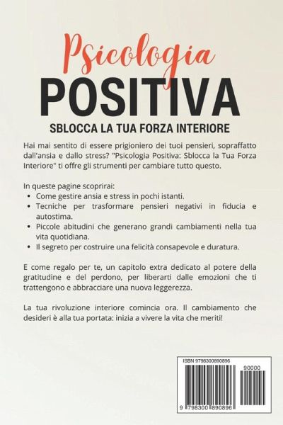 Psicologia Positiva: Sblocca la Tua Forza Interiore La guida pratica per liberarti da ansia, stress e insicurezze, creando una vita di serenità, autostima e felicità quotidiana. Ti senti sopraffatto da stress e pensieri negativi? "Psicologia Positiva: Sblocca la Tua Forza Interiore" è la guida scientifica e pratica per trasformare la tua mente in soli 60 secondi al giorno. Scoprirai come: * Gestire ansia e stress: Tecniche rapide per ritrovare calma e affrontare le sfide quotidiane. * Liberarti dai pensieri negativi: Smetti di rimuginare e porta la tua attenzione al presente. * Aumentare autostima e fiducia: Supera il dubbio di non essere abbastanza con piccoli passi concreti. * Creare abitudini vincenti: Piccoli cambiamenti quotidiani che portano grandi risultati. * Migliorare le relazioni: Costruisci connessioni autentiche con strumenti di comunicazione assertiva. * Vivere il momento presente: Il capitolo bonus La Magia della Mindfulness ti guiderà verso una calma profonda con esercizi come il Body Scan e il respiro consapevole. Perché questo libro è diverso? Ogni capitolo offre strumenti pratici, da applicare subito, per ottenere risultati immediati. Il capitolo extra sulla mindfulness ti insegna a vivere con consapevolezza ogni istante. Sei pronto a trasformare la tua vita? Inizia ora a costruire una vita più equilibrata e felice, un minuto alla volta!