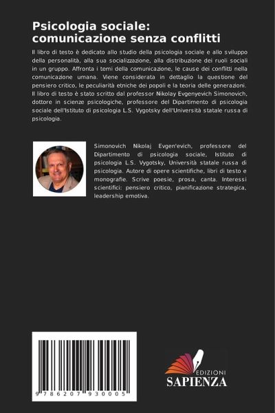 Il libro di testo è dedicato allo studio della psicologia sociale e allo sviluppo della personalità, alla sua socializzazione, alla distribuzione dei ruoli sociali in un gruppo. Affronta i temi della comunicazione, le cause dei conflitti nella comunicazione umana. Viene considerata in dettaglio la questione del pensiero critico, le peculiarità etniche dei popoli e la teoria delle generazioni.Il libro di testo è stato scritto dal professor Nikolay Evgenyevich Simonovich, dottore in scienze psicologiche, professore del Dipartimento di psicologia sociale dell'Istituto di psicologia L.S. Vygotsky dell'Università statale russa di psicologia.