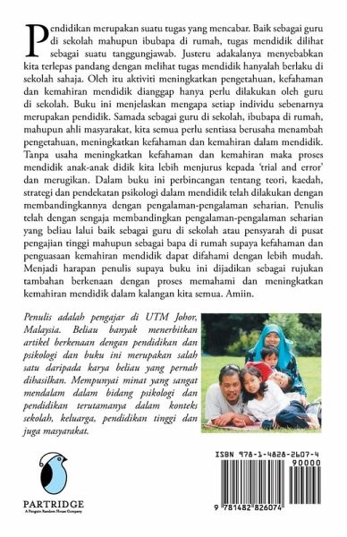 Pendidikan merupakan suatu tugas yang mencabar. Baik sebagai guru di sekolah mahupun ibubapa di rumah, tugas mendidik dilihat sebagai suatu tanggungjawab. Justeru adakalanya menyebabkan kita terlepas pandang dengan melihat tugas mendidik hanyalah berlaku di sekolah sahaja. Oleh itu aktiviti meningkatkan pengetahuan, kefahaman dan kemahiran mendidik dianggap hanya perlu dilakukan oleh guru di sekolah. Buku ini menjelaskan mengapa setiap individu sebenarnya merupakan pendidik. Samada sebagai guru di sekolah, ibubapa di rumah, mahupun ahli masyarakat, kita semua perlu sentiasa berusaha menambah pengetahuan, meningkatkan kefahaman dan kemahiran dalam mendidik. Tanpa usaha meningkatkan kefahaman dan kemahiran maka proses mendidik anak-anak didik kita lebih menjurus kepada 'trial and error' dan merugikan. Dalam buku ini perbincangan tentang teori, kaedah, strategi dan pendekatan psikologi dalam mendidik telah dilakukan dengan membandingkannya dengan pengalaman-pengalaman seharian. Penulis telah dengan sengaja membandingkan pengalaman-pengalaman seharian yang beliau lalui baik sebagai guru di sekolah atau pensyarah di pusat pengajian tinggi mahupun sebagai bapa di rumah supaya kefahaman dan penguasaan kemahiran mendidik dapat difahami dengan lebih mudah. Menjadi harapan penulis supaya buku ini dijadikan sebagai rujukan tambahan berkenaan dengan proses memahami dan meningkatkan kemahiran mendidik dalam kalangan kita semua. Amiin.