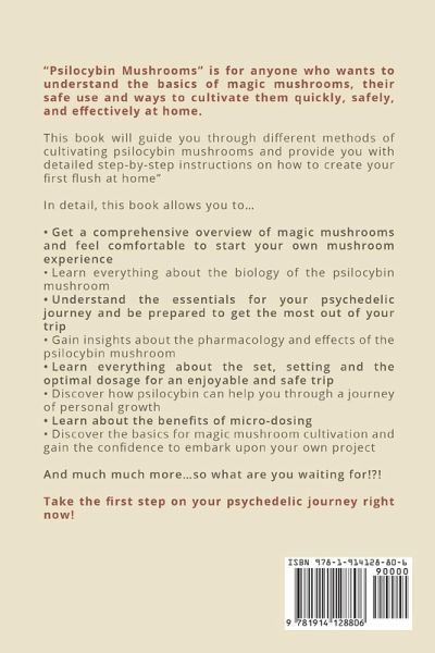 "Psilocybin Mushrooms" is for anyone who wants to understand the basics of magic mushrooms, their safe use and ways to cultivate them quickly, safely, and effectively at home. This book will guide you through different methods of cultivating psilocybin mushrooms and provide you with detailed step-by-step instructions on how to create your first flush at home" In detail, this book allows you to... · Get a comprehensive overview of magic mushrooms and feel comfortable to start your own mushroom experience · Learn everything about the biology of the psilocybin mushroom · Understand the essentials…mehr