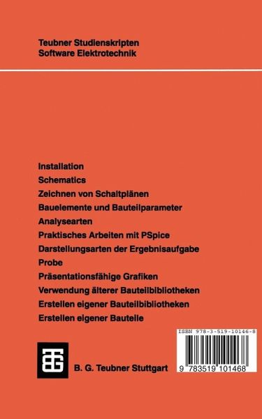1 Einleitung.- 2 Installation.- 3 Schematics.- 3.1 Aufruf der Bauteile.- 3.2 Die verschiedenen Spannungs- und Stromquellen.- 3.3 Gesteuerte Quellen (linear).- 3.4 Passive Bauelemente.- 3.5 Halbleiterbauelemente.- 3.6 Eingabe veränderlicher Bauteile.- 3.7 Analysearten.- 3.8 Verwendung älterer Bauteilbibliotheken.- 4 Praktisches Arbeiten mit PSpice.- 4.1 Eingabe des Schaltplanes.- 4.2 Berechnung.- 4.3 Grafische Darstellung der Berechnungsergebnisse -Probe.- 4.4 Ausdrucken der Grafik.- 4.5 Ausdrucken des Schaltplanes.- 4.6 Ausdrucken einer Stückliste.- 4.7 Verwendung älterer PSpice-Netzlisten.- 4.8 Häufige Fehler.- 5 Darstellungsarten der Ergebnisausgabe.- 5.1 Ausgabe der Rechenwerte als Tabelle und als Diagramm.- 5.2 Ausgabe als Grafik mit dem Programm Probe.- 5.3 Beispiele für die grafische Ausgabe mit Probe.- 6 Eigene Bauteilbibliotheken.- 6.1 Erstellen und Ändern einer eigenen Bauteilbibliothek.- 6.2 Einbinden einer bestehenden Bauteilbibliothek in Schematics.- Literaturhinweise.- Stichwortverzeichnis.