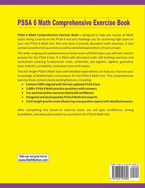 Do NOT take the PSSA test without reviewing the Math questions in this Exercise book! PSSA Math Comprehensive Exercise Book is designed to help you review all Math topics being covered on the PSSA test and challenge you for achieving high score on your real PSSA Math test. Not only does it provide abundant math exercises, it also contains practice test questions as well as detailed explanations of each answer. This wide-ranging and updated exercise book covers all Math topics you will ever need to prepare for the PSSA test. It is filled with abundant math skill building exercises and worksheets covering fundamental math, arithmetic, pre-algebra, algebra, geometry, basic statistics, probability, and many more math topics. Answers are provided for all questions. Two full-length PSSA Math tests with detailed explanations can help you improve your knowledge of Mathematics and prepare for the PSSA Math test. This comprehensive exercise book contains many exciting features, including: * Content 100% aligned with the last updated PSSA test * 3,000+ PSSA Math practice questions with answers * Fun and interactive exercises that build confidence * Designed and developed by PSSA Math test experts * 2 full-length practice tests (featuring new question types) with detailed answers After completing this hands-on exercise book, you will gain confidence, strong foundation, and adequate practice to succeed on the PSSA Math test. Get ready for the PSSA Math Test with a PERFECT Math Exercise Book! Published By: Math Notion WWW.MathNotion.com