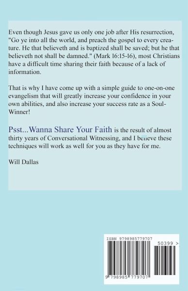 Even though Jesus gave us only one job after his resurrection, "Go ye into all of the world and preach the gospel. He that believeth and is baptized shall be saved; but he that believeth not shall be damned." Mark 16:15-16, Most Christians have a difficult time sharing their faith because of a lack of information. That is why I have come up with a simple guide to one-on-one evangelism that will greatly increase your confidence in your own abilities, and also increase your success rate as a Soul-Winner! "Psst...Wanna Share Your Faith?" is the result of almost thirty years of Conversational Witnessing, and I believe these techniques will work as well for you as they have for me. Will Dallas