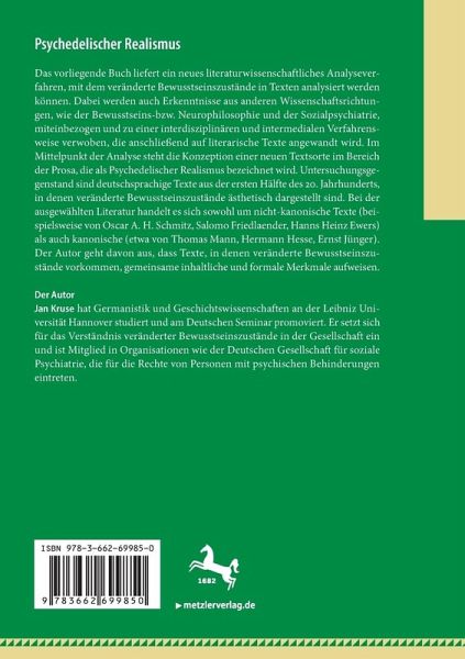 Das vorliegende Buch liefert ein neues literaturwissenschaftliches Analyseverfahren, mit dem veränderte Bewusstseinszustände in Texten analysiert werden können. Dabei werden auch Erkenntnisse aus anderen Wissenschaftsrichtungen, wie der Bewusstseins- bzw. Neurophilosophie und der Sozialpsychiatrie, miteinbezogen und zu einer interdisziplinären und intermedialen Verfahrensweise verwoben, die anschließend auf literarische Texte angewandt wird. Im Mittelpunkt der Analyse steht die Konzeption einer neuen Textsorte im Bereich der Prosa, die als Psychedelischer Realismus bezeichnet wird. Untersuchungsgegenstand sind deutschsprachige Texte aus der ersten Hälfte des 20. Jahrhunderts, in denen veränderte Bewusstseinszustände ästhetisch dargestellt sind. Bei der ausgewählten Literatur handelt es sich sowohl um nicht-kanonische Texte (beispielsweise von Oscar A. H. Schmitz, Salomo Friedlaender, Hanns Heinz Ewers) als auch kanonische (etwa von Thomas Mann, Hermann Hesse, Ernst Jünger). Der Autor geht davon aus, dass Texte, in denen veränderte Bewusstseinszustände vorkommen, gemeinsame inhaltliche und formale Merkmale aufweisen.