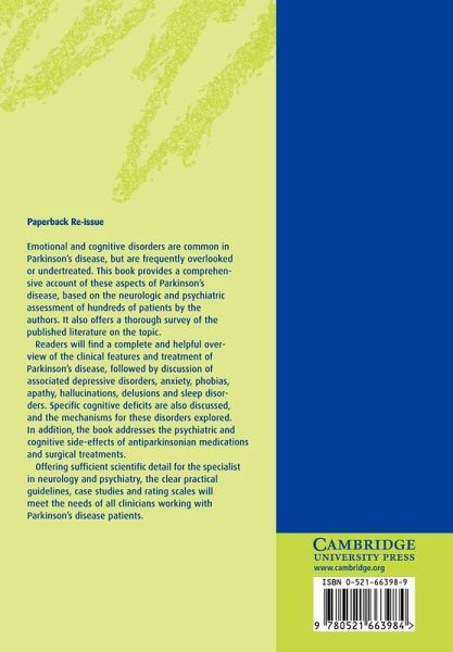 Emotional and cognitive disorders are common in Parkinson's disease, but are frequently overlooked or undertreated. This book provides a comprehensive account of these aspects of Parkinson's disease, based on the neurological and psychiatric assessment of hundreds of patients by the authors. It also offers a thorough survey of the published literature on the topic. Readers will find a complete and helpful overview of the clinical features and treatment of Parkinson's disease, followed by discussion of associated depressive disorders, anxiety, phobias, apathy, hallucinations, delusions and sleep disorders. Specific cognitive deficits are also discussed, and the mechanisms for these disorders explored. The book also addresses the psychiatric and cognitive side effects of anti-parkinsonian medications and surgical treatments. Offering sufficient scientific detail for the specialist in neurology and psychiatry, the clear practical guidelines, case studies and rating scales will meet the needs of all clinicians working with Parkinson's disease patients.