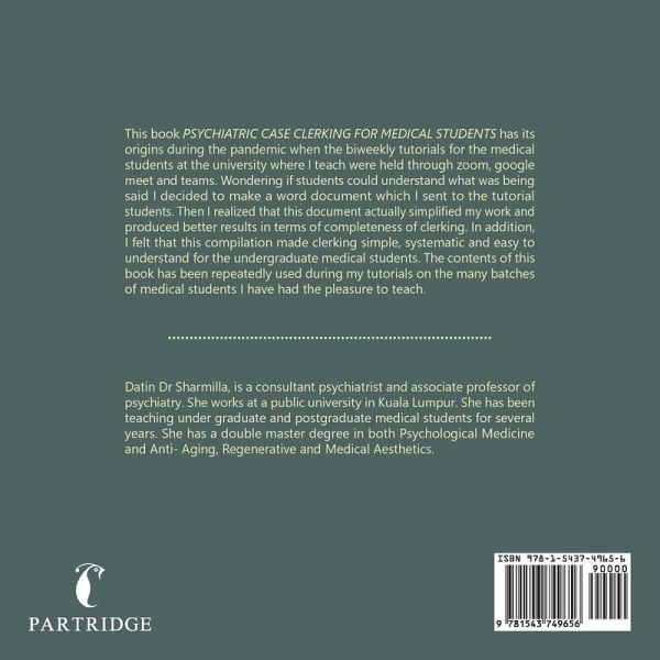 This book PSYCHIATRIC CASE CLERKING FOR MEDICAL STUDENTS has its origins during the pandemic when the biweekly tutorials for the medical students at the university where I teach were held through zoom, google meet and teams. Wondering if students could understand what was being said I decided to make a word document which I sent to the tutorial students. Then I realized that this document actually simplified my work and produced better results in terms of completeness of clerking. In addition, I felt that this compilation made clerking simple, systematic and easy to understand for the undergraduate medical students. The contents of this book has been repeatedly used during my tutorials on the many batches of medical students I have had the pleasure to teach.