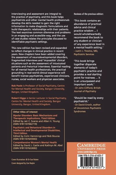 Part I. What Am I Trying to Find Out Here?: 1. Diagnosis 2. History 3. Mental state examination and psychopathology 4. Cognitive state examination and organic disease Part II. The Main Principles of One-to-One Interviewing: 5. Office-based psychiatric assessment 6. Understanding and managing relationships with patients Part III. Difficult Interviews: 7. Difficulties relating to psychosis 8. Unpopular patients Part IV. Self-Awareness: 9. Values and beliefs 10. Culture 11. Who should I be? Part V. Complicated Interviews: 12. Interviewing with other team members 13. Interviewing families and other informants 14. In the community 15. Fragmented interviewing and assessment 16. 'Impossible' assessments Part VI. Developmental Assessments: 17. Neurodevelopmental assessment 18. Personality Part VII. Drawing it All Together: 19. Risk and safety 20. Record keeping and reports.
