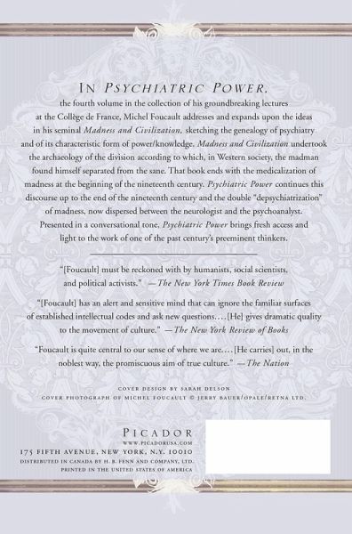 In Psychiatric Power, the fourth volume in the collection of his groundbreaking lectures at the Collège de France, Michel Foucault addresses and expands upon the ideas in his seminal Madness and Civilization, sketching the genealogy of psychiatry and of its characteristic form of power/knowledge. Madness and Civilization undertook the archeology of the division according to which, in Western Society, the madman found himself separated from the sane. That book ends with the medicalization of madness at the beginning of the nineteenth century. Psychiatric Power continues this discourse up to the end of the nineteenth century, and the double "depsychiatrization" of madness, now dispersed between the neurologist and the psychoanalyst. Presented in a conversational tone, Psychiatric Power brings fresh access and light to the work of one of the past century's preeminent thinkers.