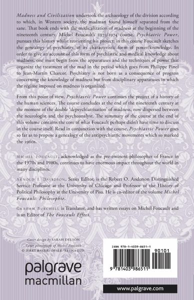 In this addition to the Collège de France Lecture Series Michel Foucault explores the birth of psychiatry, examining Western society's division of 'mad' and 'sane' and how medicine and law influenced these attitudes. This seminal new work by a leading thinker of the modern age opens new vistas within historical and philosophical study.