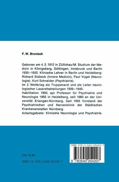 I. Klinisch-diagnostische Daten.- Gesichtsfeldausfälle.- Fingerperimetrie.- Geruchsprüfung.- Geschmacksprüfung.- Die segmentale bzw. radikuläre und periphere Innervation der Muskeln.- Die klinisch wichtigsten Reflexe.- Sdiema der segmentalen bzw. radikulären und der peripheren Hautinnervationen.- Topographische Beziehungen zwischen den Rückenmarksegmenten und den Wirbelkörpern, Dornfortsätzen und Wurzelaustrittsstellen.- Aphasie, Alexie, Agraphie, Akalkulie, Apraxie.- Intelligenzprüfung.- Testuntersuchungen.- Kombinierter erweiterter Queckenstedt-Versuch.- Prostigmin-Test.- Tensilon-Test.- Muskelbiopsie.- Nervenbiopsie.- Gehirnbiopsie.- II. Apparative Diagnostik.- Die konventionelle elektrische Untersuchung der Nerven und Muskeln.- Bestimmung der motorischen Chronaxie.- Elektromyographie.- Echoencephalographie.- Elektrencephalographie (EEG).- III. Neuroradiologie.- Nativbilder.- Kontrastmittelverfahren.- IV. Labordiagnostik.- Wichtige Normaldaten.- Liquor-Normalwerte.- Leber-Funktionsdiagnostik.- Magen-Darm-Funktionsdiagnostik.- Nieren-Funktionsdiagnostik.- Funktionsdiagnostik der endokrinen Organe.- Komplementbindungsreaktion (KBR).- Chromosomenzählung.- V. Stufen und Phasen der psychischen Entwicklung.- 1. Die postnatale Periode.- 2. Säuglingsalter.- 3. Frühe Kindheit.- 4. Mittlere und späte Kindheit.- 5. Reifealter.- VI. Therapeutische Daten.- Cortison-Behandlung.- ACTH-Behandlung der Multiplen Sklerose.- Penicillinbehandlung der Neurolues.- Fieberkur der Neurolues.- Paravertebrale Infiltration.- Sakral-(Epidural-) Anaesthesie.- Stellatum-Blockade.- Peridural-Anaesthesie.- Paravertebrale Grenzstrang-Blockade.- Antabusbehandlung.- Rauschgiftsucht-Definition (WHO).- Untergruppen des Alkoholismus.- Weitere Möglichkeiten der Betreuung des Alkoholikers.-Alkoholdelir-Behandlung.- Chronischer Schlafmittel- und Schmerzmittelabusus.- Akute Katatonie.- Sondenfütterung.- Insulinbehandlung der Psychosen.- Subkoma-Behandlung.- Elektro-Heilkrampf-Behandlung.- Unilaterale Hirndurchflutung.- VII. Akute Notfälle.- A. Elementartherapie.- B. Spezielle Therapie.- C. Vergiftungen.- VIII. Anfallstypen und Antiepileptica.- Propulsiv-petit mal (BNS-Krämpfe, Blitz-Nick-Salaam-Krämpfe).- Absencen-Epilepsie (Retropulsiv-petit mal).- Impulsiv-petit mal (myoklonisdie Epilepsie).- Grand mal (generalisierter Anfallstyp).- Fokaler Anfallstyp.- Schläfenlappen-Epilepsie.- Kombinationspräparate.- Nebenwirkungen.- Grundsätzliches zur Therapie.- IX. Psychopharmaka.- Neuroleptica.- Thymeretica (Monoaminoxydasehemmer).- Thymoleptica.- Lithium-Präparate.- Tranquilizer.- Nebenwirkungen der Thymoleptica.- Nebenwirkungen der Thymeretica.- Neurologische Begleitwirkungen der Neuroleptica.- Nebenwirkungen der Lithiumtherapie.- X. Statistisches.- A. Neurologische Krankheiten.- B. Psychiatrische Krankheiten.- XI. Berufskrankheiten.- A. Durch diemische Stoffe verursachte Krankheiten.- B. Durch physikalische Einwirkungen verursachte Krankheiten.- C. Durch gemischte (chemisch-physikalische) Einwirkungen verursachte Krankheiten.- D. Durch Infektionserreger oder Parasiten verursachte Krankheiten.- E. Durch nicht einheitliche Einwirkungen verursachte Krankheiten.- F. Hauterkrankungen.- XII. Gutachten, Zeugnisse und Atteste.- Rentenversicherung.- Kriegsopferversorgung (KOV).- Härteausgleich.- Gesetzliche Unfallversicherung.- Bundesentschädigungsgesetz (BEG).- Verkehrstauglichkeit (Fahrtauglichkeit).- MdE-Tabelle für periphere Nervenschädigungen.- Alkoholgutachten.- Private Unfallversicherung.- Haftpflichtversicherung.- Schwangerschaftsunterbrechung.-Neufassung des Gesetzes über die Entschädigung von Zeugen und Sachverständigen (GEZS) vom 15. 9. 1969, ab 1. 10. 1969 in Kraft.- XIII. Rechtliches.- A. Arztrechtliches.- B. Zivilrechtliches.- C. Strafrechtliches.- XIV. Instanzen und Institutionen.- Therapeutische Institutionen.- Spezielle Vereinigungen, Gesellschaften und Ligen.- XV. Hinweise auf die psychiatrisch-neurologische Literatur.- Neuropathologie.- Handbücher.- Lehrbücher der Psychiatrie und Übersichten.- Lehrbücher der Neurologie und Psychiatrie.- Lehrbücher der Neurologie.- Monographien.- Neuroradiologie, Elektroencephalographie und Elektromyographie.- Allgemeines.- Deutschsprachige Fachzeitschriften für Neurologie und Psychiatrie.- Deutsche Ubersetzung der Internationalen Klassifikation der Psychiatrischen Krankheiten (Diagnosenschlüssel der WHO: ICD).- Sadiverzeichnis.- Quellenverzeichnis der Abbildungen.