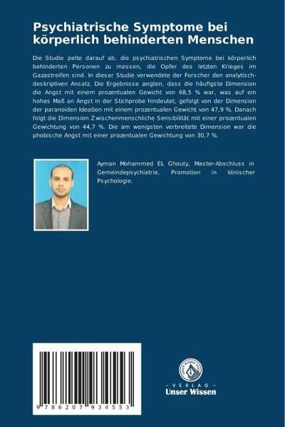 Die Studie zielte darauf ab, die psychiatrischen Symptome bei körperlich behinderten Personen zu messen, die Opfer des letzten Krieges im Gazastreifen sind. In dieser Studie verwendete der Forscher den analytisch-deskriptiven Ansatz. Die Ergebnisse zeigten, dass die häufigste Dimension die Angst mit einem prozentualen Gewicht von 68,5 % war, was auf ein hohes Maß an Angst in der Stichprobe hindeutet, gefolgt von der Dimension der paranoiden Ideation mit einem prozentualen Gewicht von 47,9 %. Danach folgt die Dimension Zwischenmenschliche Sensibilität mit einer prozentualen Gewichtung von 44,7 %. Die am wenigsten verbreitete Dimension war die phobische Angst mit einer prozentualen Gewichtung von 30,7 %.